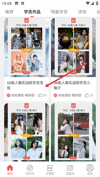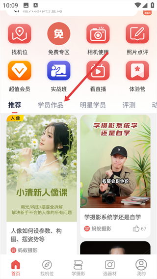 1、在首页找到“学员作品”标签并点击,进入学员作品展示页面。