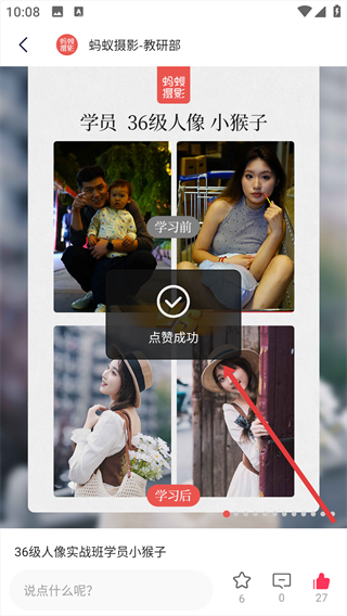 4、页面弹出“点赞成功”提示,完成对该学员作品的点赞。