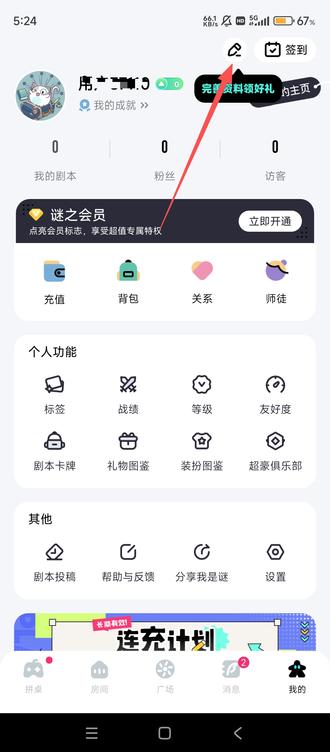 2、在个人页面,点击右上角编辑图标,即可进入【我是谜】资料编辑页面哦。