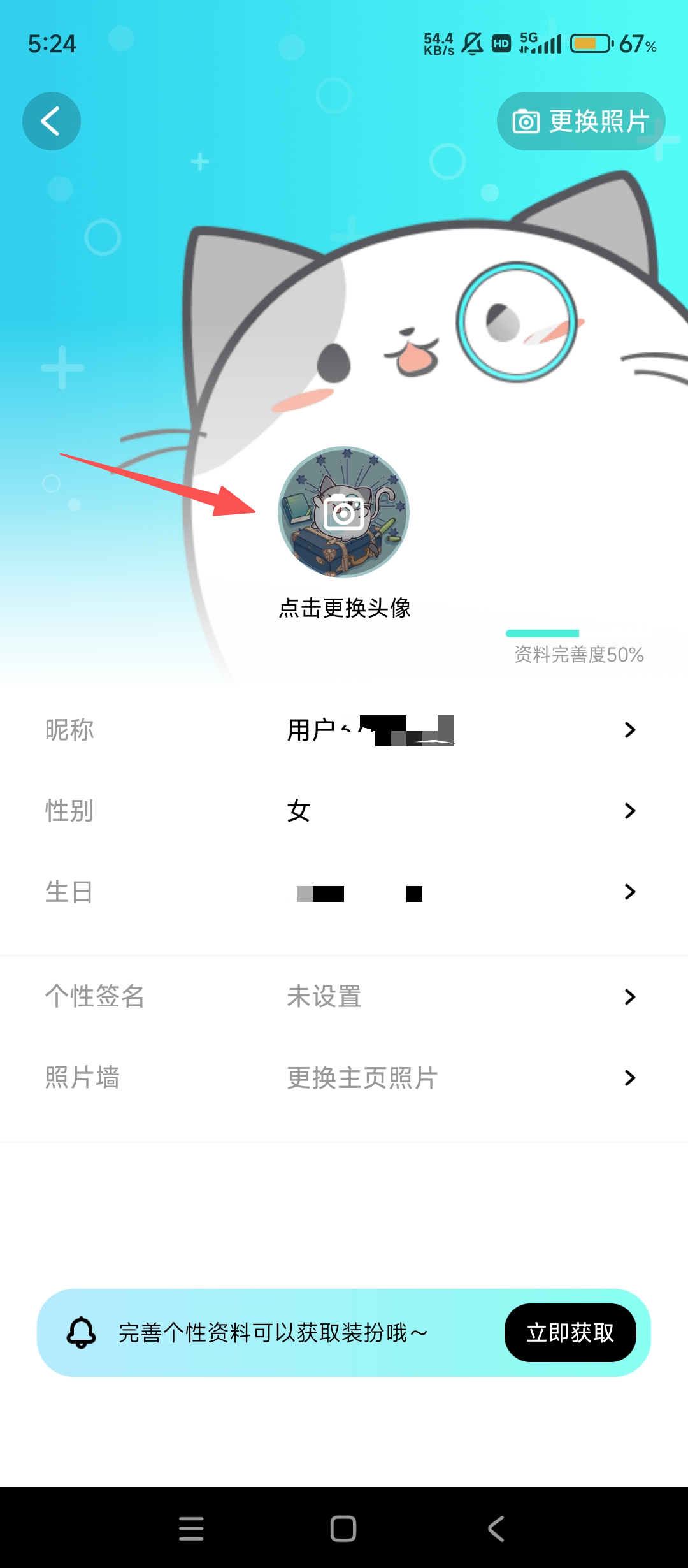 3、在资料编辑页,点击【点击更换头像】的按钮,就能发起更换头像的操作呢。