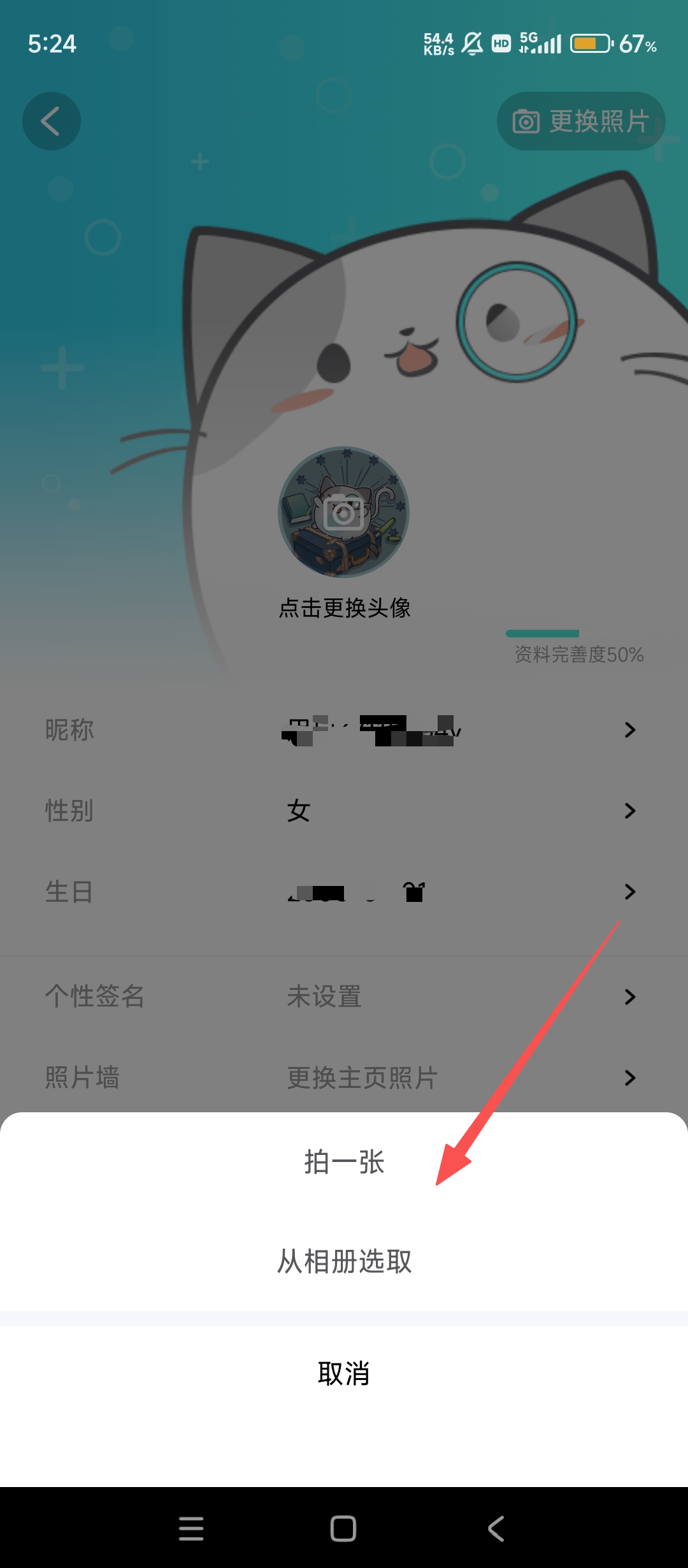 4、此时会弹出选项,我们选择【拍一张】或【从相册选取】,就能完成头像更换啦。