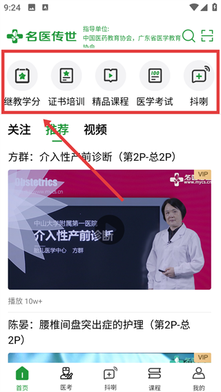 1、打开名医传世APP,首页有【继教学分】、【精品课程】等功能,可根据需求点击对应板块开启学习呢。