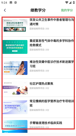 2、点击【继教学分】,里面有多个国家级推荐项目,我们可挑选感兴趣的课程,参与学习获取学分呀。