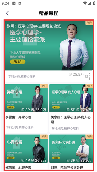 3、进入【精品课程】板块,有各类专科课程,像精神心理科等,我们可选择课程观看,提升专业知识哦。