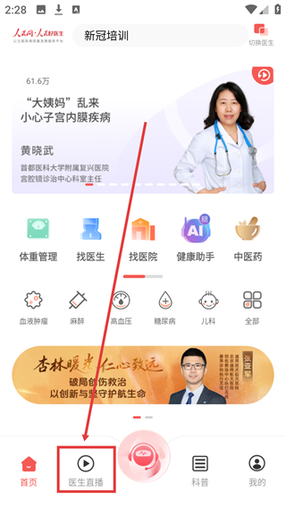 1、在首页底部找到【医生直播】入口,点击该入口可进入直播页面,查看医生相关直播内容。