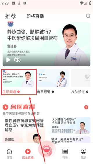 2、进入医生直播页面后,找到【生活频道】选项并点击,可进入生活类直播汇总页面,查看生活相关直播。