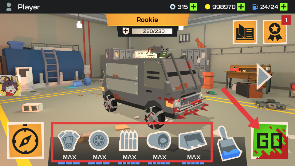 1、在车库界面,升级车辆的部件,提升车辆性能后,点击【GO】进入游戏。
