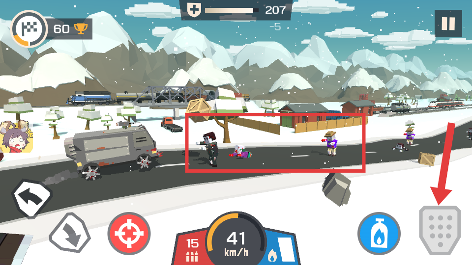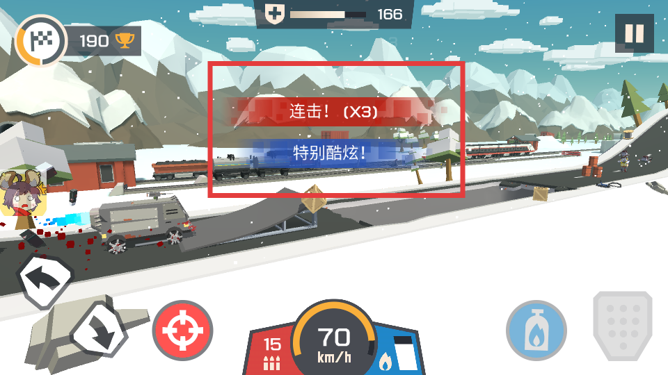 2、进入游戏后,利用右侧的加速按钮控制车辆速度,左侧的方向和攻击按钮操控车辆移动和攻击,在道路上行驶,撞击或射击僵尸。