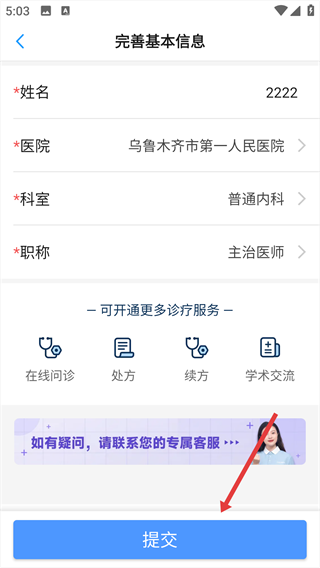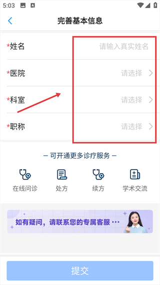 3、依次填写姓名,并选择所属医院、对应科室及职称等必填信息。