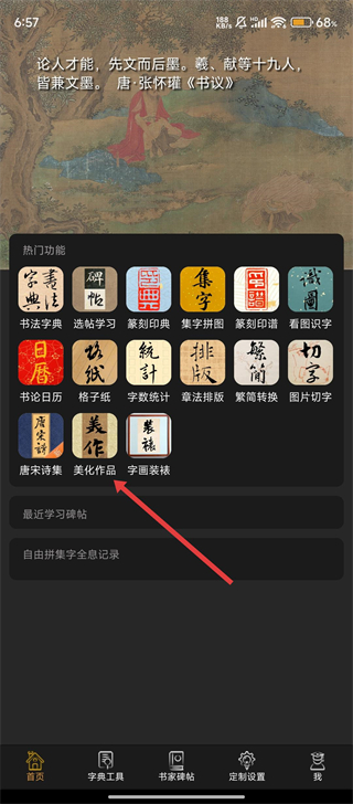 1、打开不厌书法App,我们可以在热门功能区找到【美化作品】选项,点击它即可进入作品美化的操作界面啦。