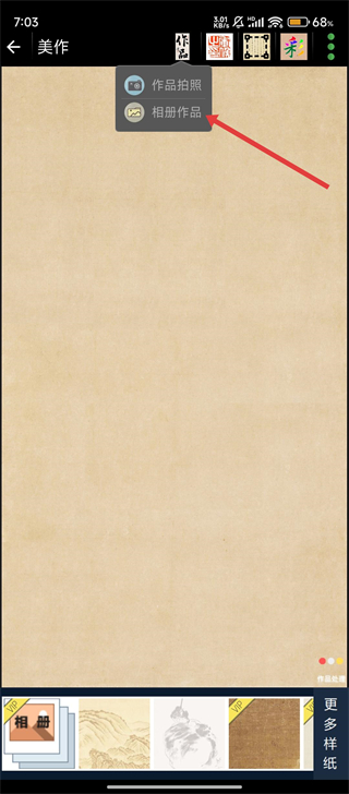 2、进入【美作】界面后,我们可以点击弹出的【相册作品】选项,选择从手机相册中导入要处理的书法作品图片哦。