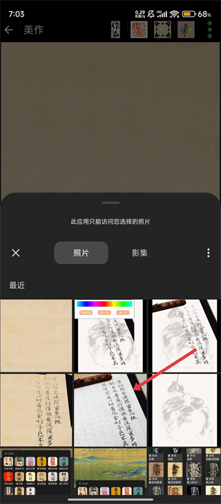 3、在相册选择界面,我们可以从最近的照片中挑选目标书法作品图片,选中后即可将其导入到美化编辑页面啦。