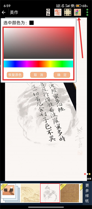 4、导入作品后,点击顶部的色彩编辑按钮,在弹出的调色面板中选择喜欢的颜色,确认后点击【确定】,就能改变字体颜色啦。