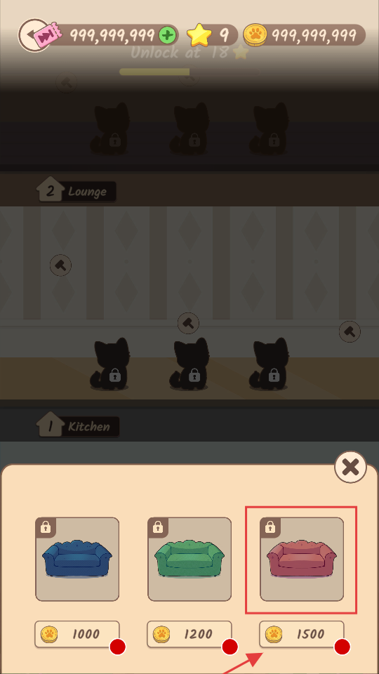 1、使用【1500】【爪子币】解锁【粉色沙发】,布置猫咪的休息区域,让萌猫拥有更舒适的停留空间。