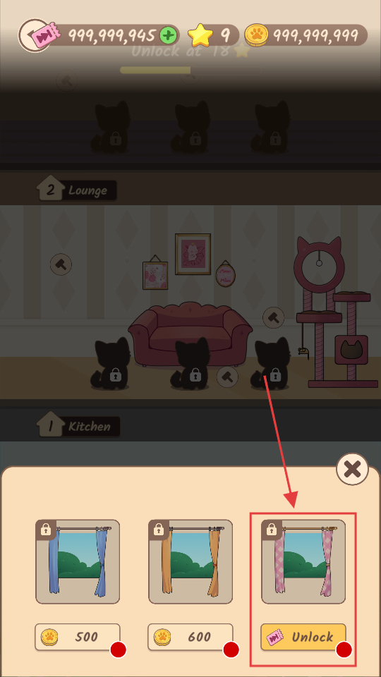 2、用对应资源解锁【粉色花纹窗帘】,装饰猫咪所在场景,提升整体环境的温馨感与美观度。