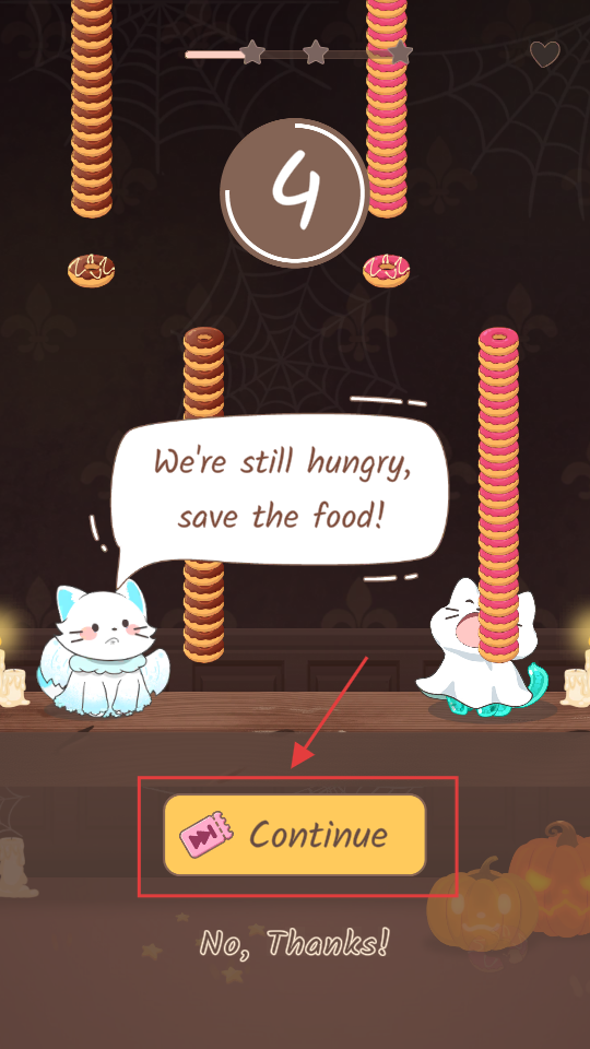 4、猫咪表示饥饿时,点击【Continue】按钮,消耗道具继续当前的音乐对战关卡。