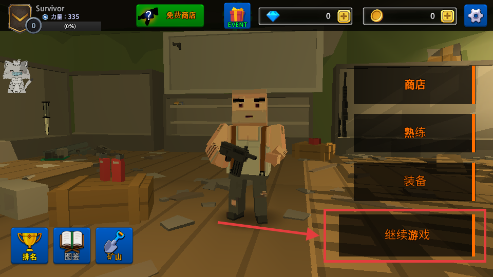 1、在游戏主界面,选择【继续游戏】进入战斗场景,也可通过【商店】【熟练】【装备】功能提前准备作战所需物资与角色配置。