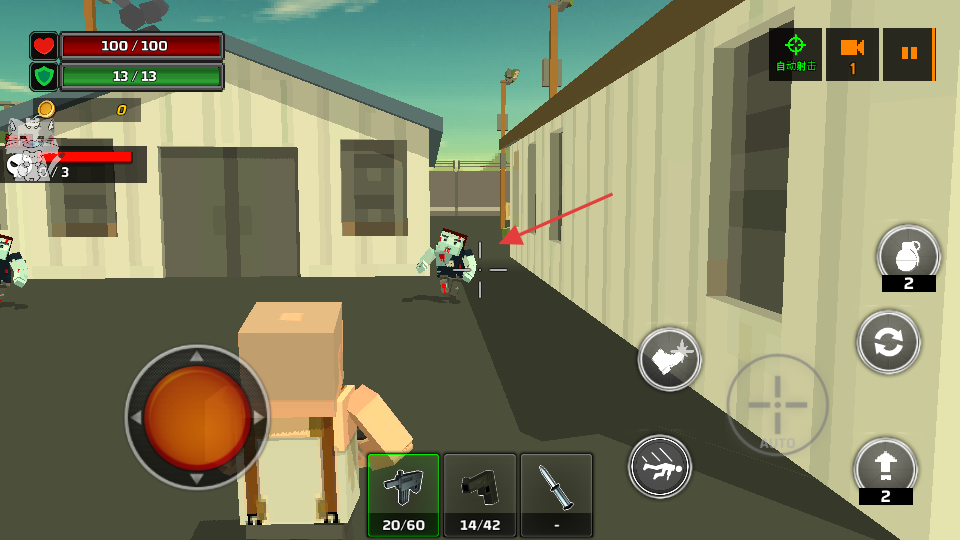 3、僵尸持续出现,用摇杆与按键控制角色移动作战,击杀所有僵尸完成关卡,操控战斗节奏。