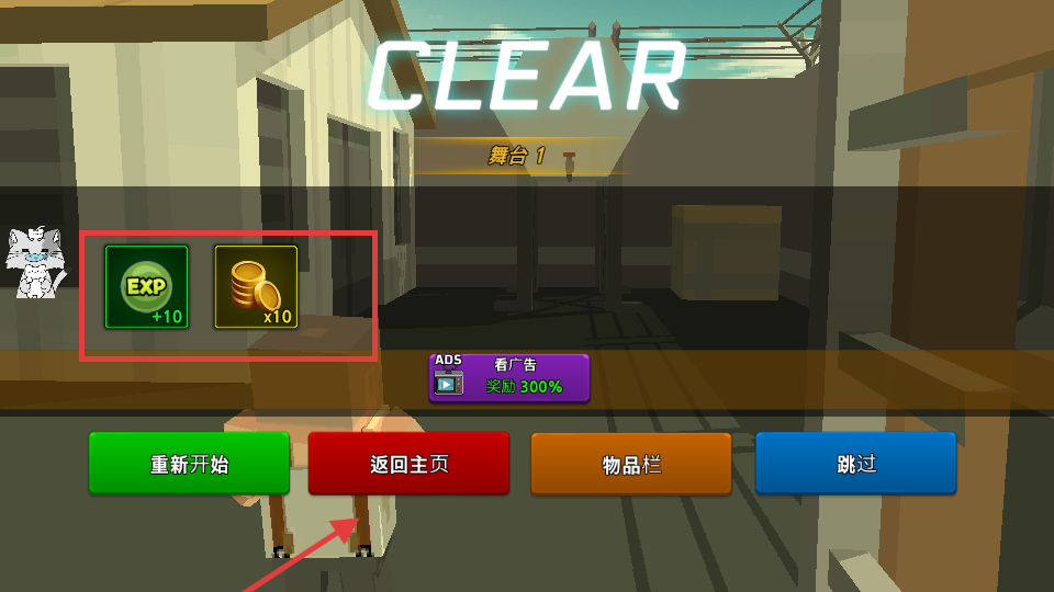 4、通关【舞台1】后获得【EXP】-【加】-【10】与【金币】-【乘】-【10】奖励,选择【返回主页】整理装备或继续挑战后续关卡。