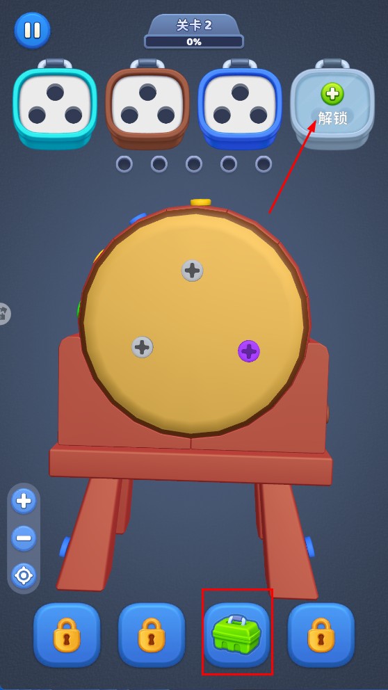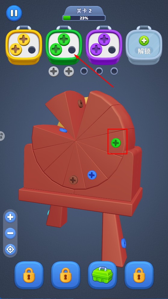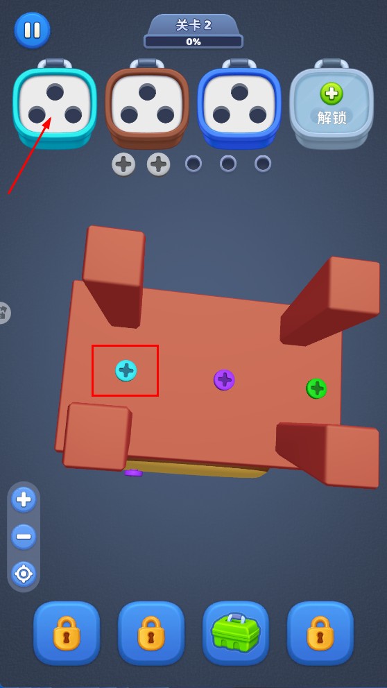 1、点击屏幕进入关卡,观察螺丝与盒子的颜色对应关系,选择合适的螺丝放入对应孔位开始消除。