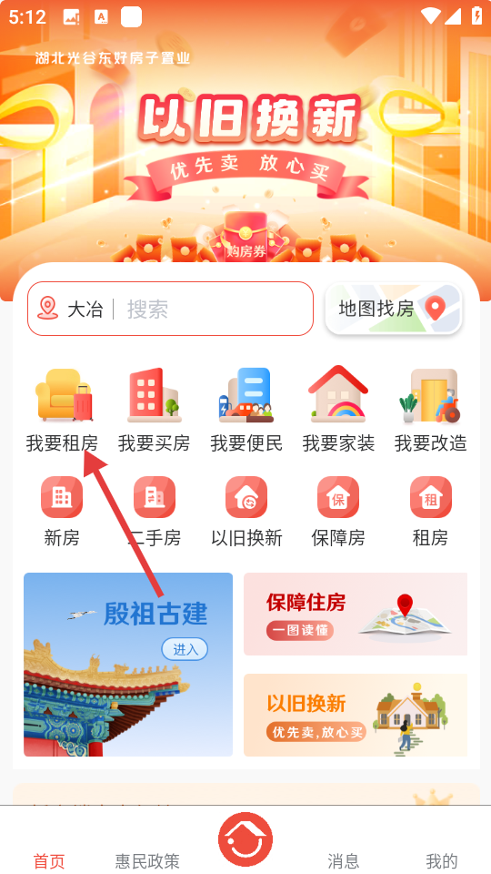 1、在首页找到【我要租房】选项,点击进入租房页面。