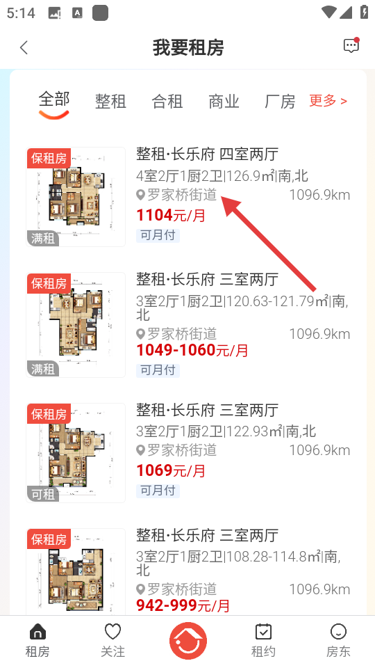 2、在租房页面浏览房源列表,找到心仪的房源,点击进入该房源详情页。