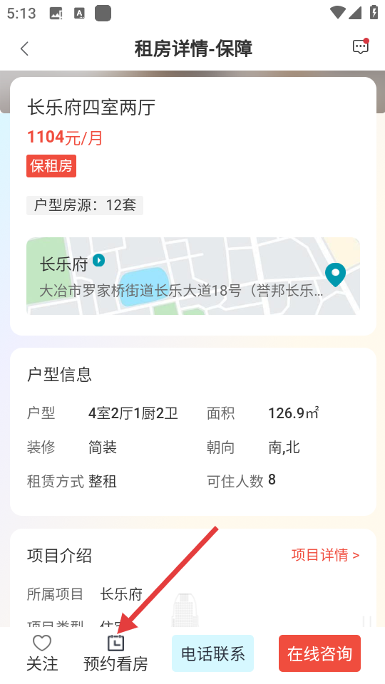 3、在房源详情页,找到【预约看房】按钮,点击进入预约看房设置界面。