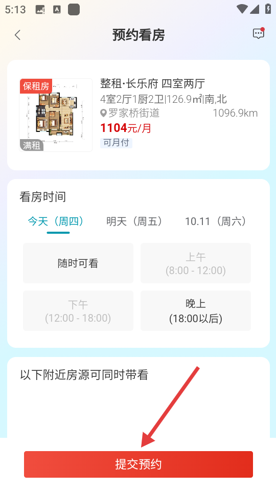 4、在预约看房界面,选择合适的看房时间后,点击【提交预约】按钮完成预约。