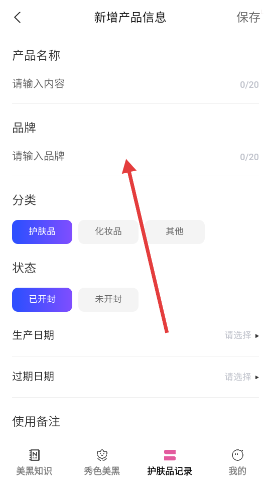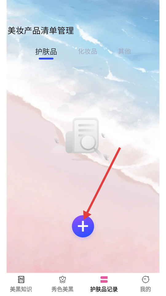 3、在护肤品记录页面,点击中间的蓝色“+”按钮。