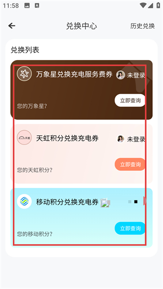 4、进入兑换中心后,可通过万象星、天虹积分、移动积分等兑换充电券(用积分抵充充电费用更划算)。