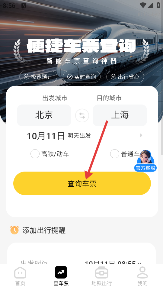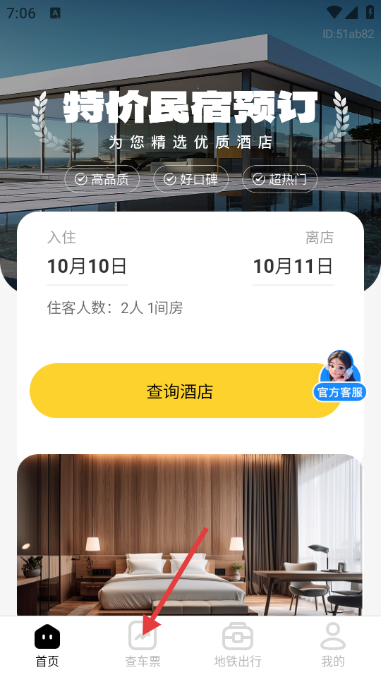 1、在主页面,点击底部导航栏中的【查车票】选项。