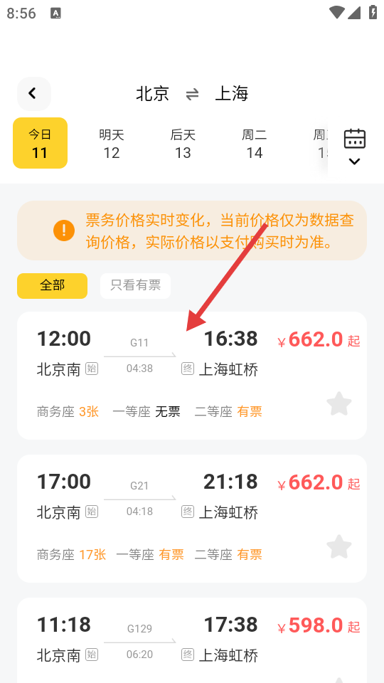 3、在车票列表页面,选择心仪的车次。