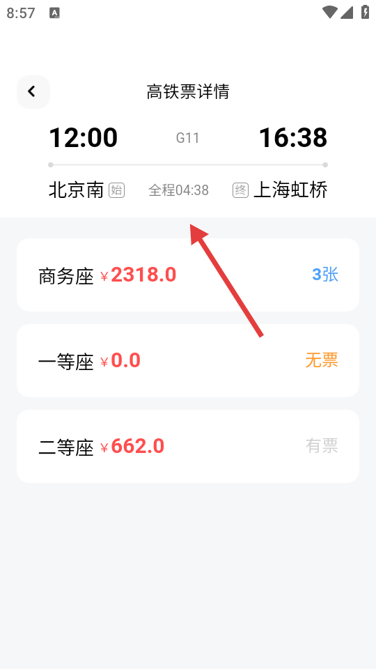 4、进入高铁票详情页面后,即可查看该车次不同座位类型的票价及余票情况。