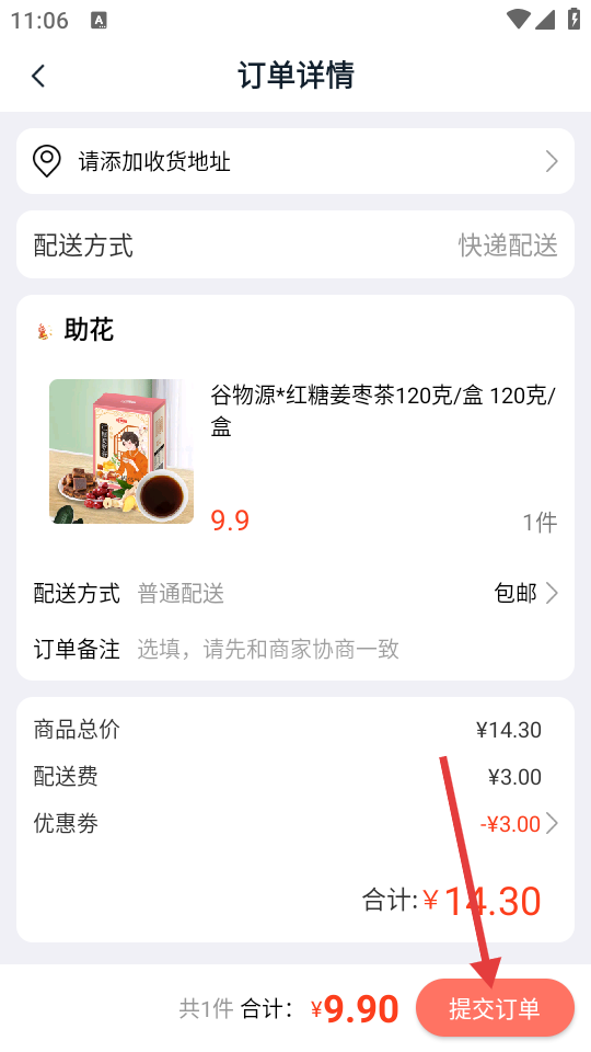 4、进入订单详情页面,添加收货地址,确认订单信息后,点击【提交订单】。