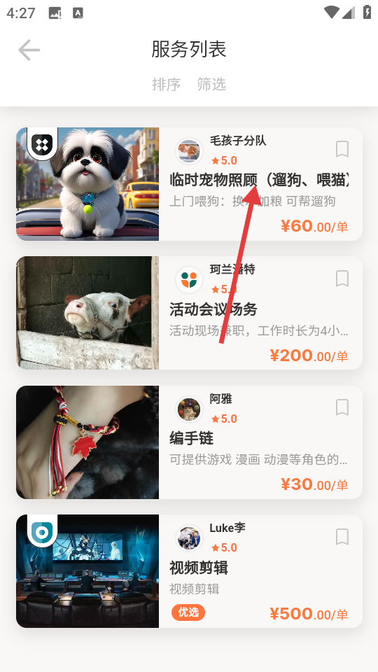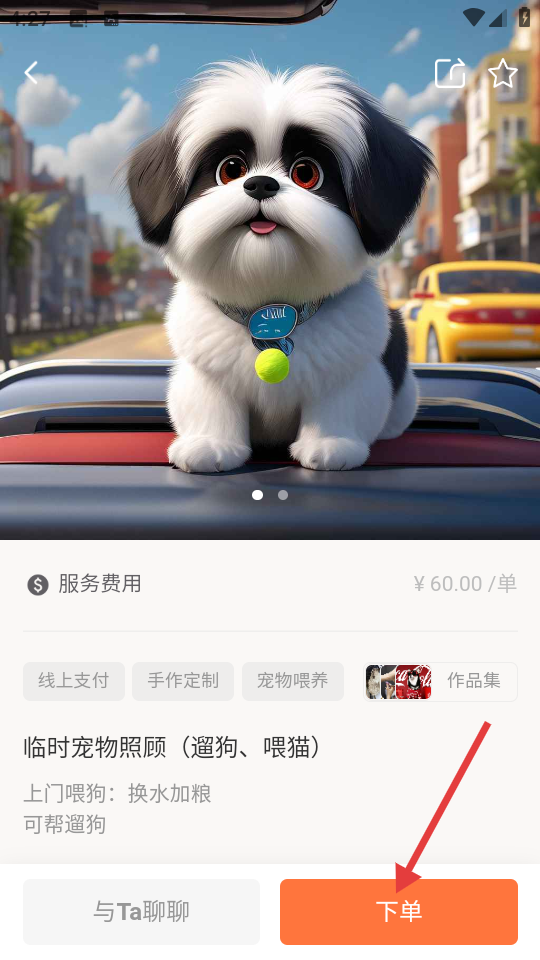 2、在服务列表中,选择如【临时宠物照顾】的服务进入详情页。