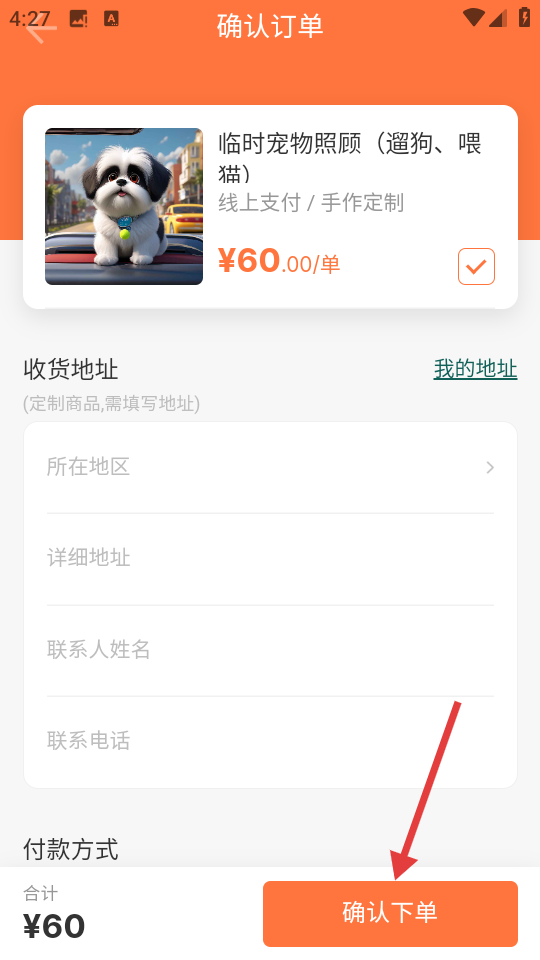 3、在服务详情页,点击【下单】按钮进入确认订单页面。