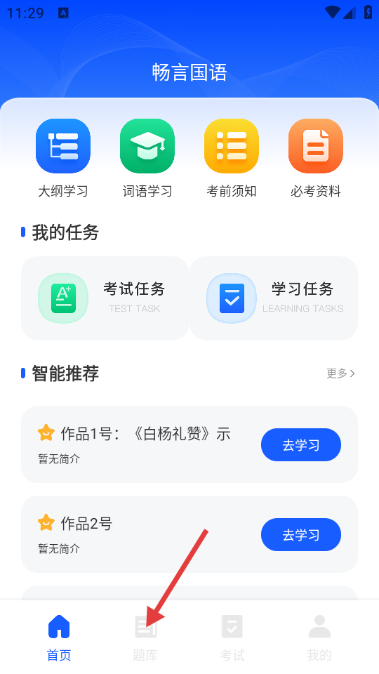 1、在APP底部导航栏,点击【题库】进入题库页面。