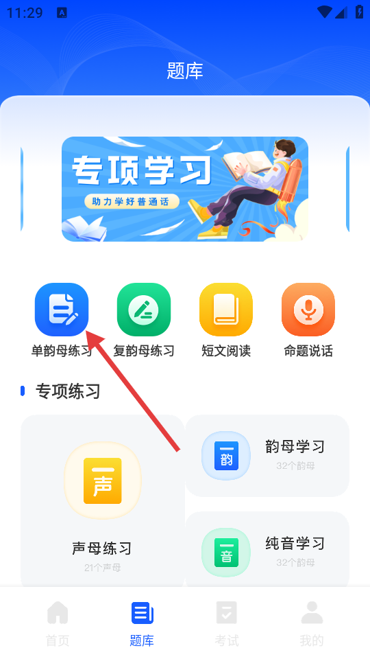 2、在题库页面,点击【单韵母练习】图标进入练习分类页面。