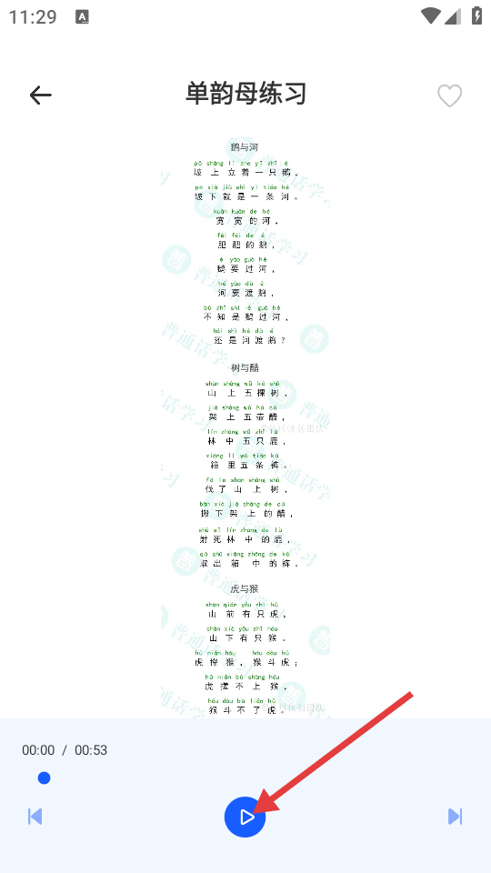 4、在单韵母练习内容页面,点击播放按钮可收听练习音频进行学习。
