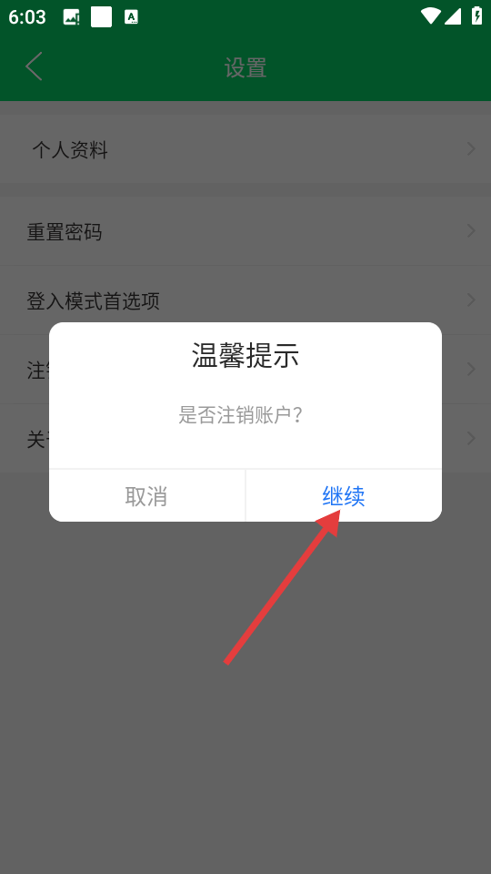 4、在注销确认页面,点击【继续】即可完成账户注销操作。