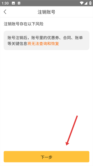 4、确认风险提示内容后,点击“下一步”按钮,推进账号注销流程。