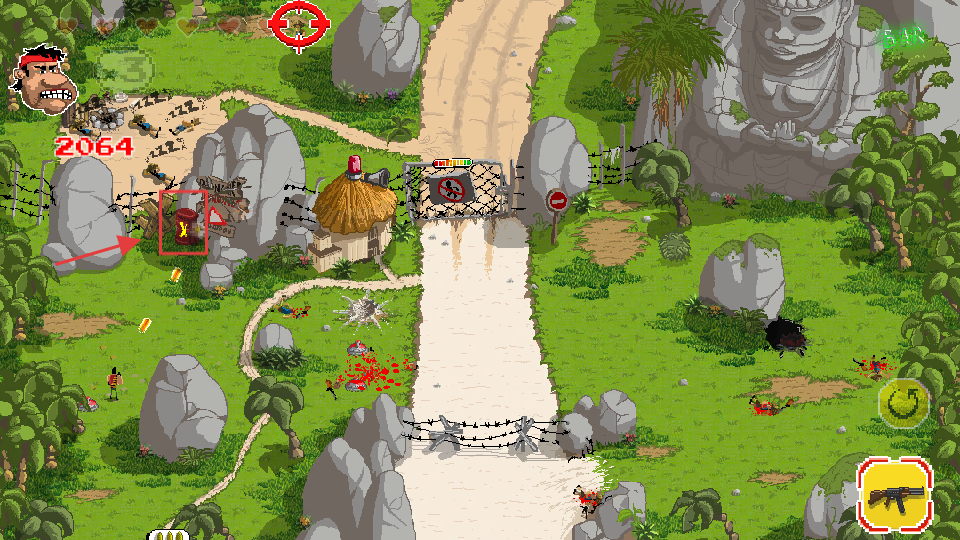 1、靠近【红色桶】,射击引爆它,利用爆炸摧毁障碍门或击杀周边敌人,助力突破关卡封锁区域。