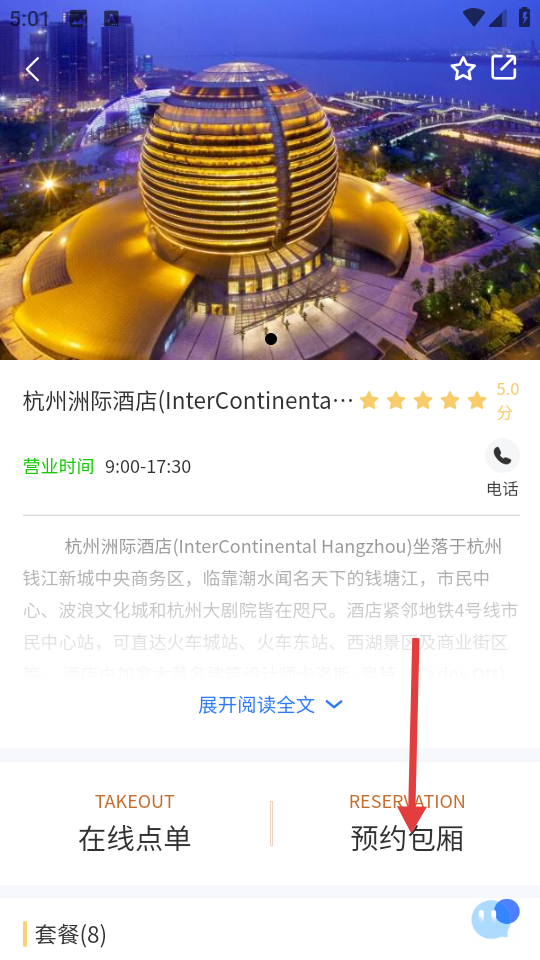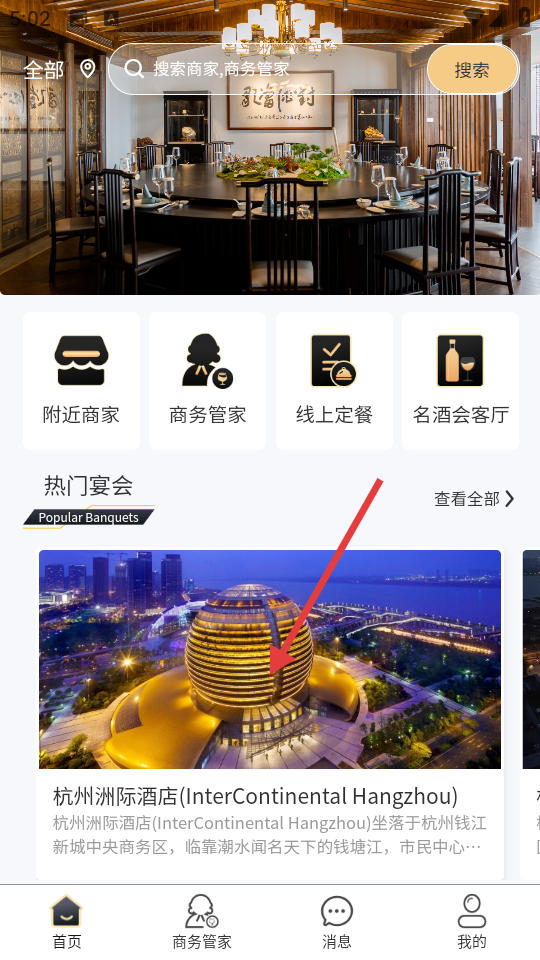 1、在首页中,点击热门宴会中的杭州洲际酒店,进入酒店详情页面。