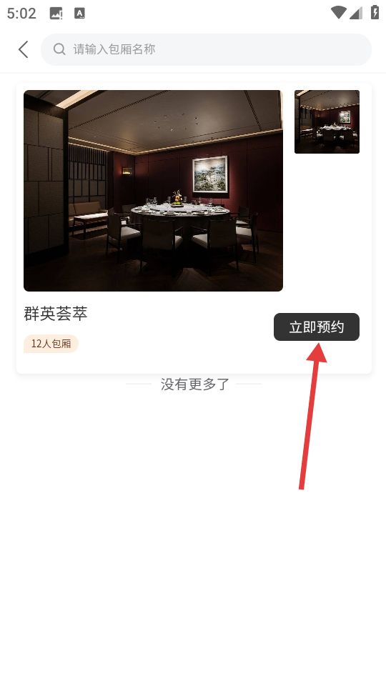 2、在酒店详情页面点击【预约包厢】,进入包厢预约页面。