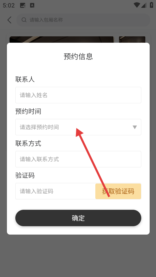 4、在预约信息弹窗中填写联系人、预约时间、联系方式和验证码,点击【确定】完成包厢预约。
