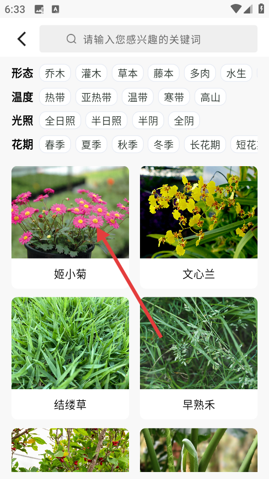 3、在植物分类页面,选择感兴趣的植物,如【姬小菊】,可进入该植物的详情页面。