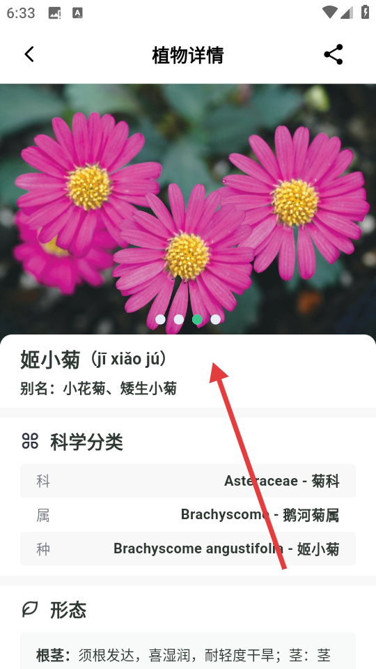 4、在植物详情页面,可查看植物的名称、别名、科学分类、形态等详细信息。