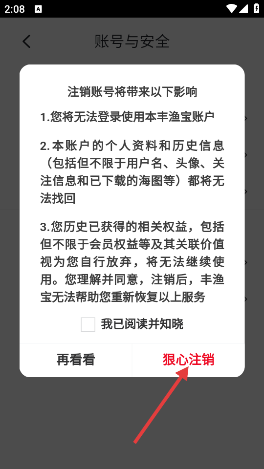 4、在注销影响说明框中,勾选“我已阅读并知晓”后,点击【狠心注销】,即可完成账号注销操作。