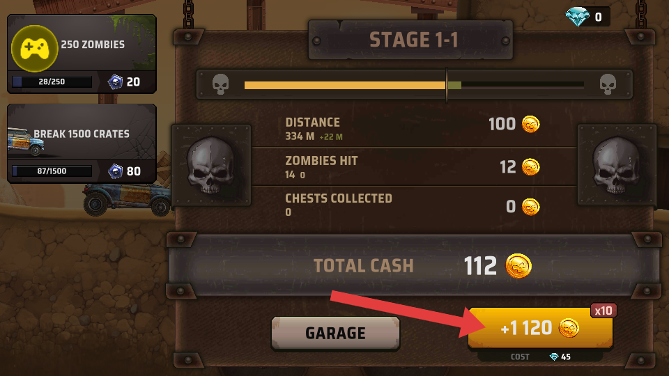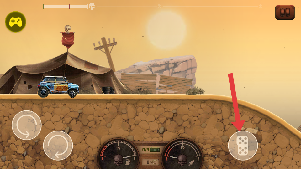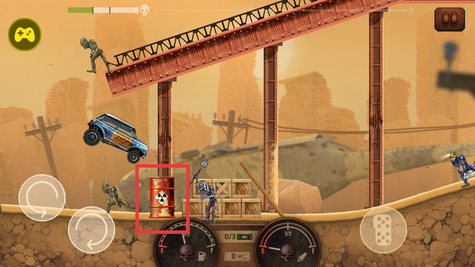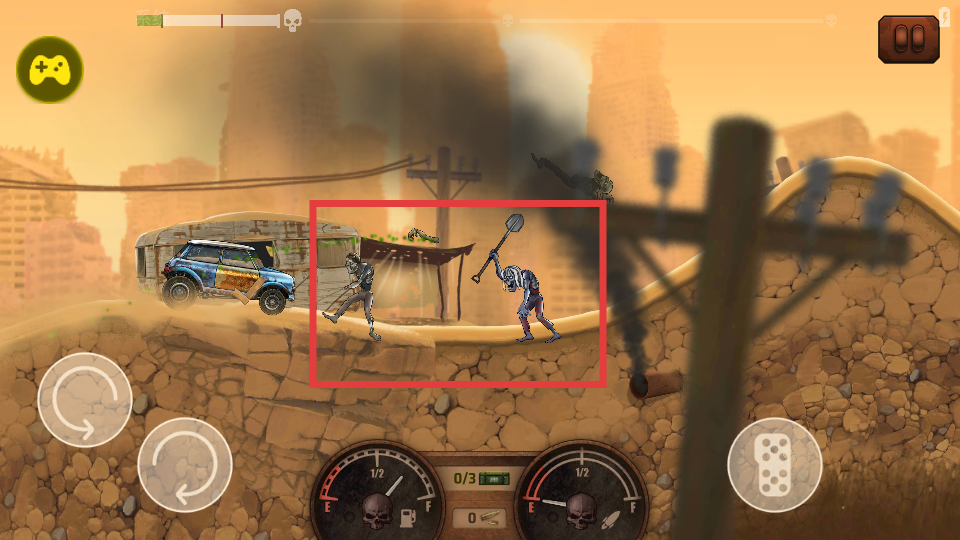 2、遇到红色方框内的僵尸障碍时,借助内置菜单的功能,操控赛车突破僵尸阻拦,继续前进。