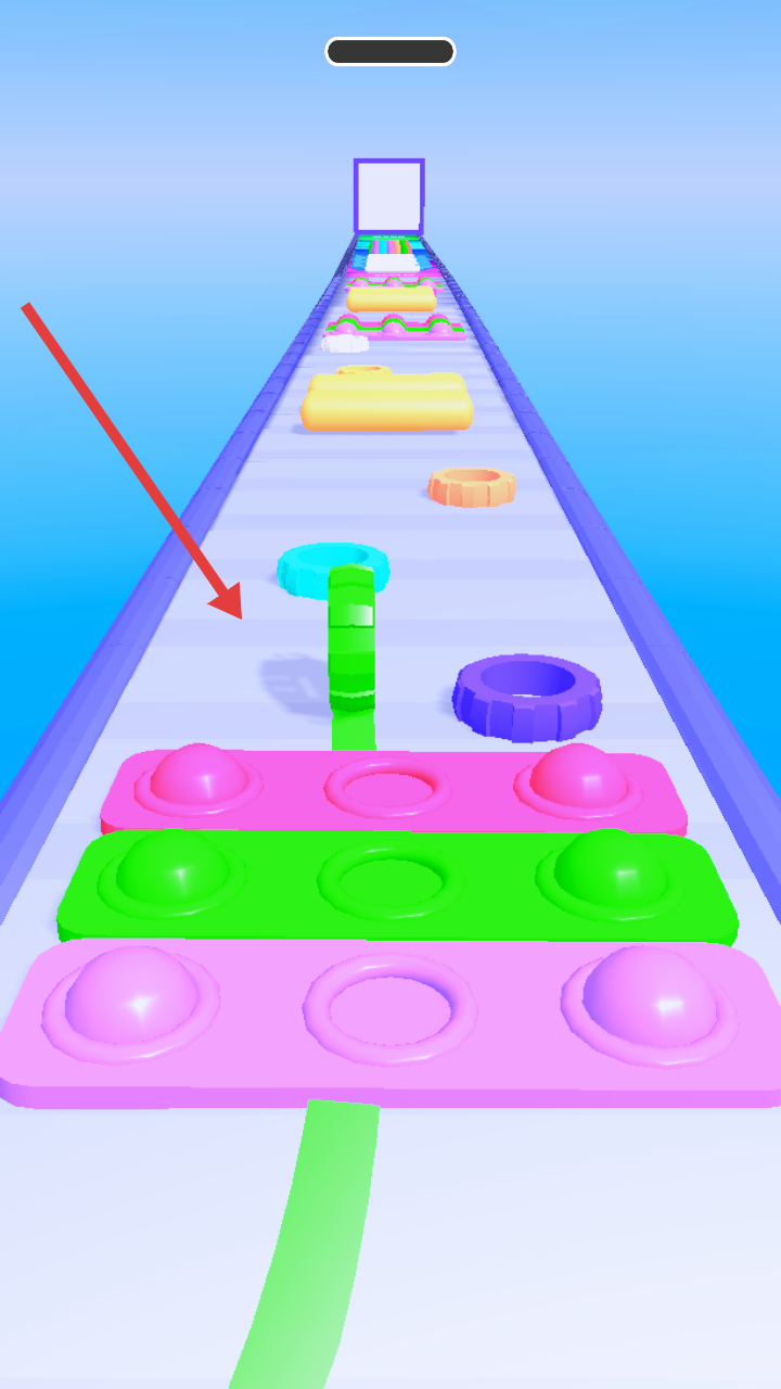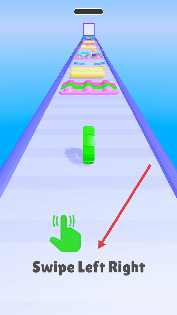 1、左右滑动屏幕,在彩色赛道场景中操控绿色物体,开启躲避障碍并击碎物体的挑战。
